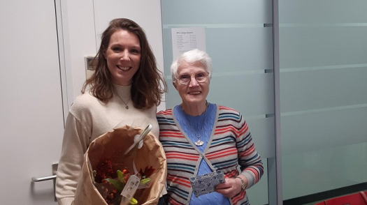 Extra bijzonder is het als vrijwilligers lang bij ons betrokken zijn. Een voorbeeld is Esther, die al 10 jaar met bevlogenheid onze doelgroep een warm hart toedraagt. Allereerst als taalcoach en sinds een aantal jaar is zij vrijwilliger bij ons Taal-Oefen-Centrum. Wij laten dit niet zomaar aan ons voorbij gaan en hebben haar verrast met een attentie!